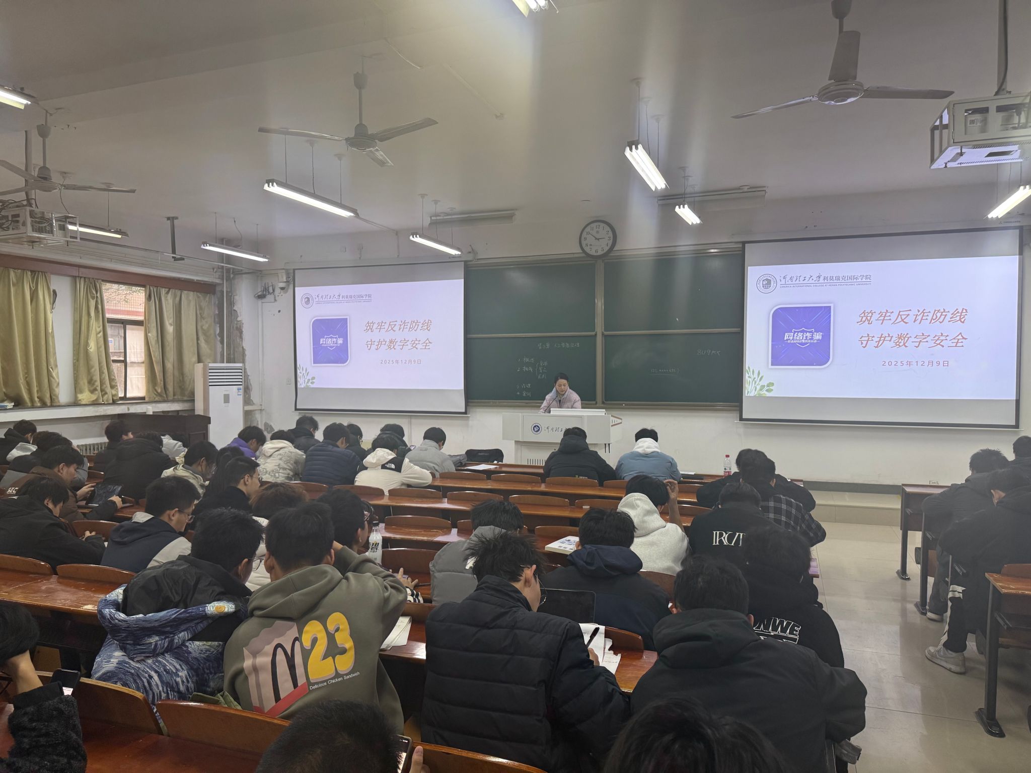 在三号教学楼3106、3107教室举办了以“筑牢反诈防线 守护数字安全”为主题的教育班会。学院辅导员桂伟峰、李瑶锦及各年级学生共同参加了本次班会。